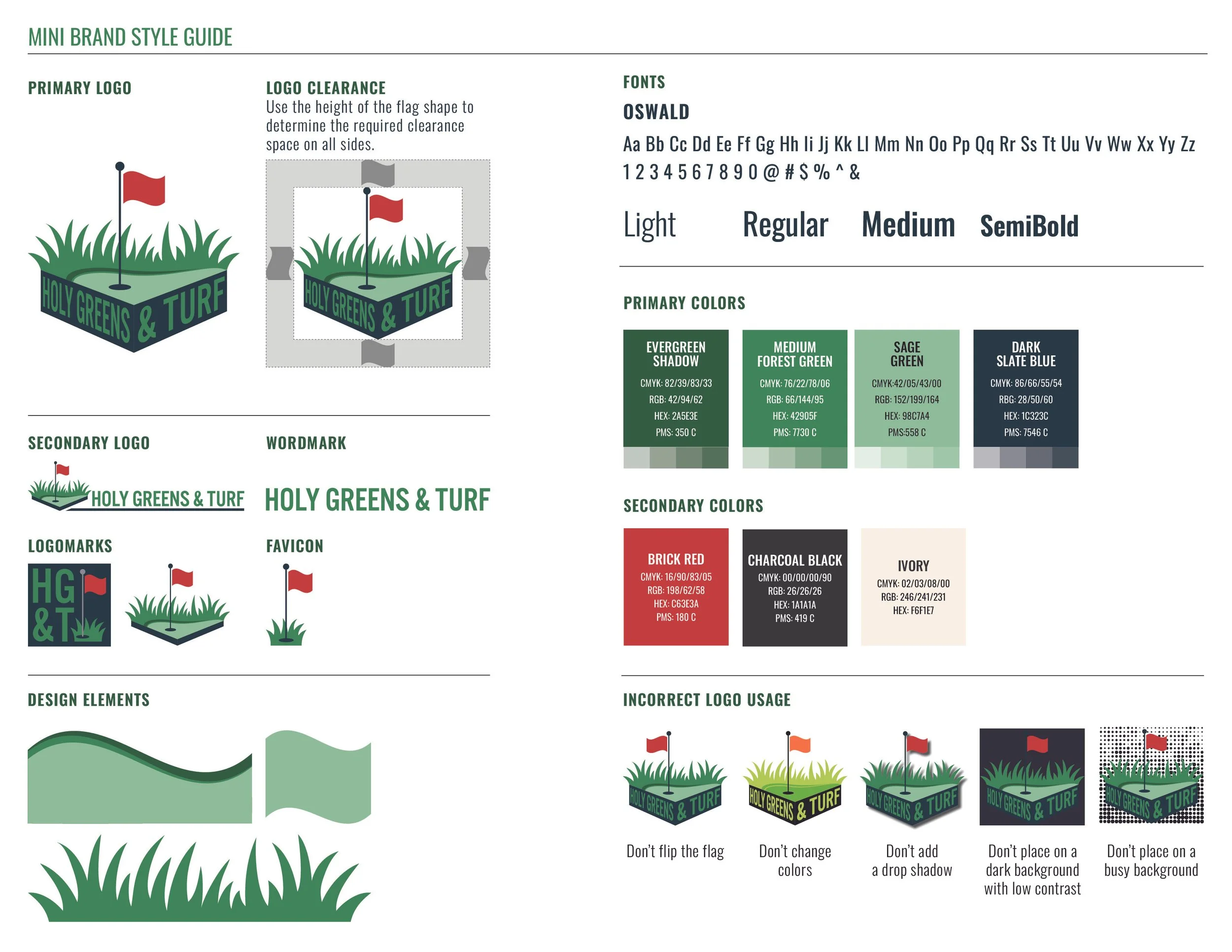 For Holy Greens & Turf, I created a bold, modern logo that clearly communicates the company’s focus on both turf and putting greens. The design solution combined strong, clean shapes with a rich color palette rooted in green to reflect landscaping. I accented the core color palette with navy for sophistication and a pop of red in the golf flag for energy and instant recognition. Once the logo was established, I extended the rebrand across all touchpoints, business stationery, social media, and the website, using the Oswald font and the refreshed color system to deliver a cohesive, contemporary brand identity.